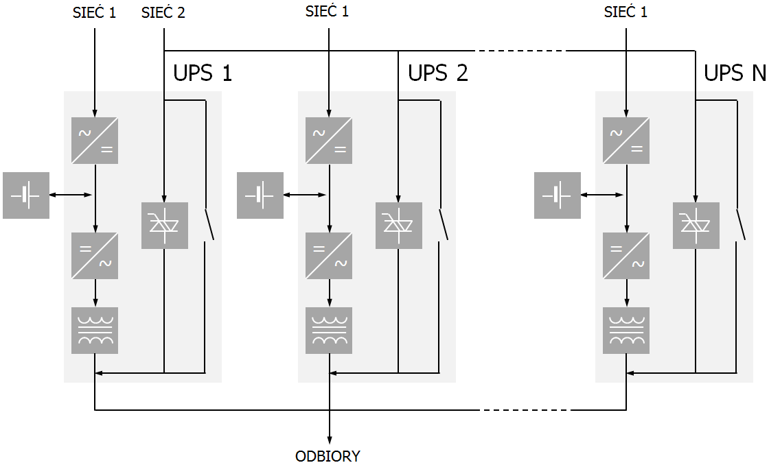 O ilości jednostek UPS w systemie równoległym decydują przede wszystkim względy ekonomiczne. Najbardziej optymalne układy również pod względem techniczno-eksploatacyjnym składają się z 3, 4 lub 5-ciu zasilaczy UPS.