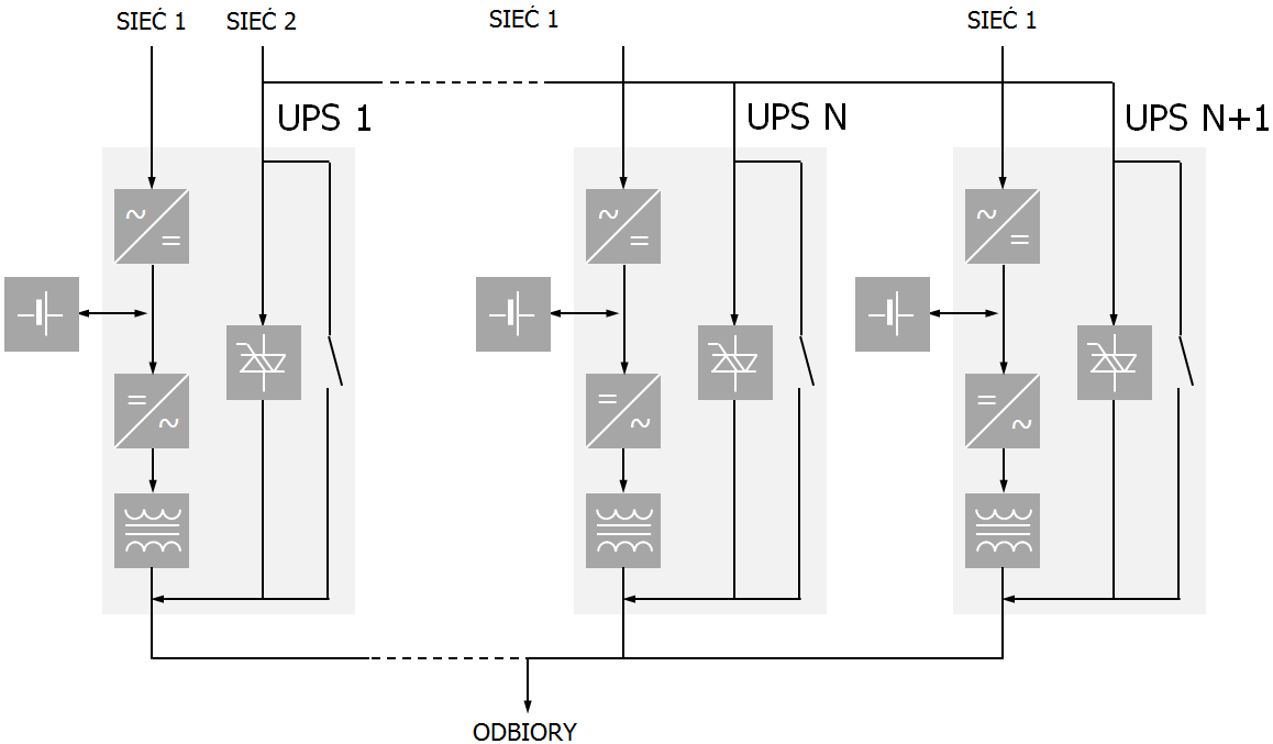 Systemy pracy równoległej w konfiguracji n+1 (n+2, …) stosuje się przede wszystkim dla zwiększenia bezpieczeństwa zasilania odbiorników. W takim układzie jeden zasilacz UPS stanowi rezerwę mocy. Prowadzenie prac konserwacyjnych czy też awaria dowolnej jednostki w systemie nie powoduje konieczności jego wyłączenia (czy przejścia na by-pass) a system zachowuje pełną funkcjonalność. System równoległy n+1 może być etapowo rozbudowywany w miarę wzrostu zapotrzebowania mocy. Tak jak w układzie n w pierwszym etapie należy zainstalować docelowy by-pass zewnętrzny. Moc układu by-pass zawsze dobiera się dla n jednostek.